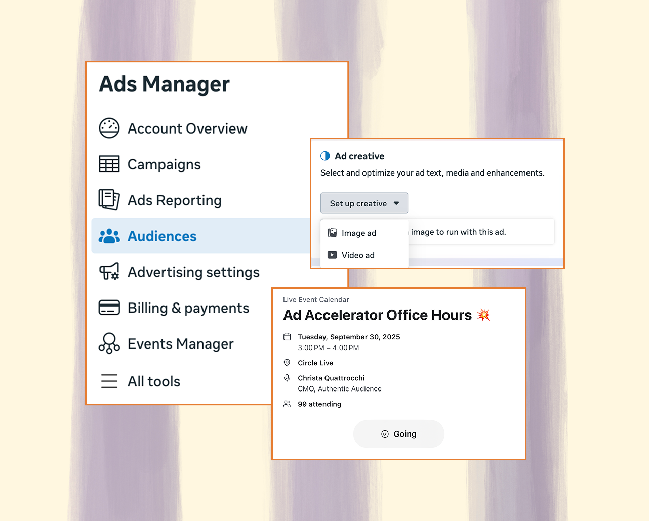 Inside the Club you get access to our signature Ad Accelerator: an agency‑grade Meta ads launch kit that walks you from pixel to profit with step‑by‑step setup, audience strategy, copy & creative templates, and live office hours with our CMO, Christa Q every month.