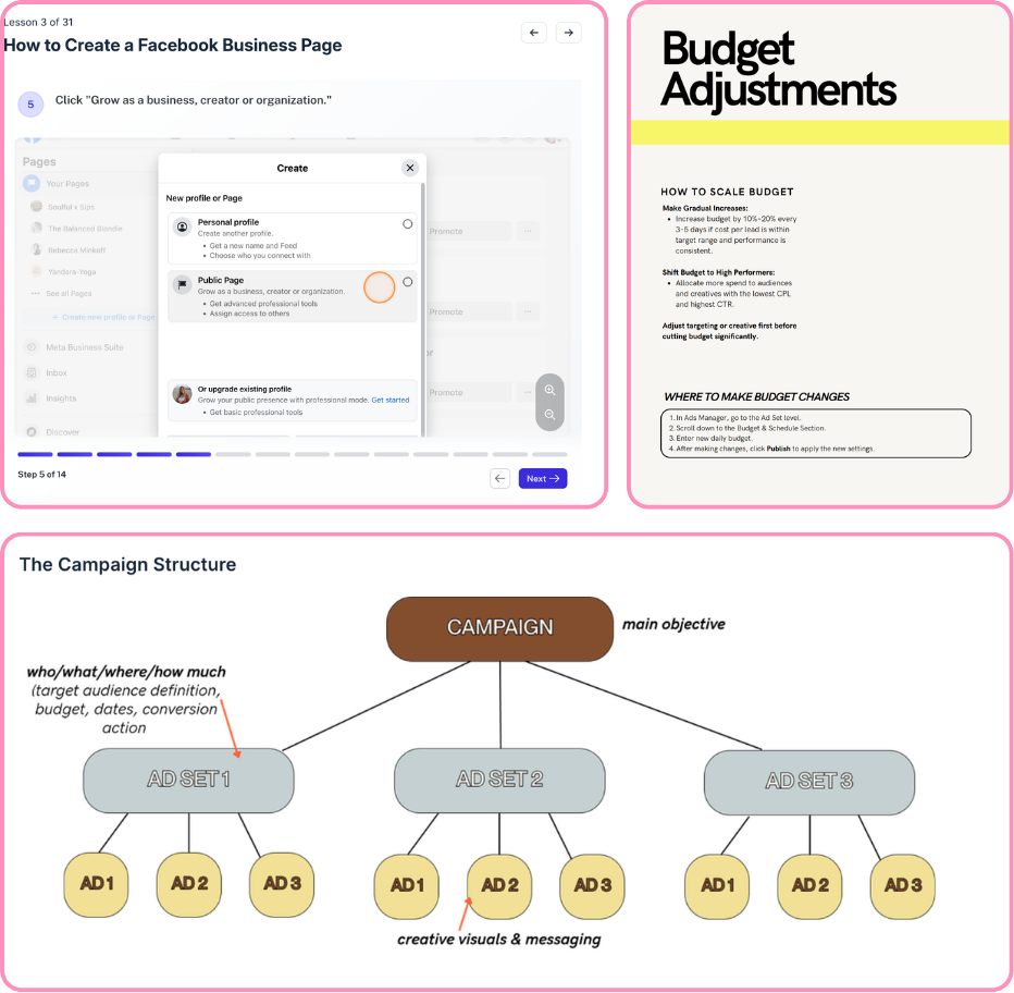 Self-paced course with video lessons, screen recordings (so you can actually see how to use the platform), and a fillable workbook.