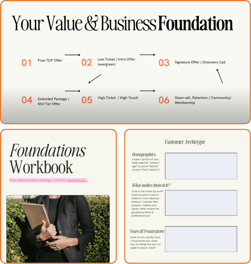 Fillable Foundations workbook to build offers, archetypes, and strategy alongside the classes.
